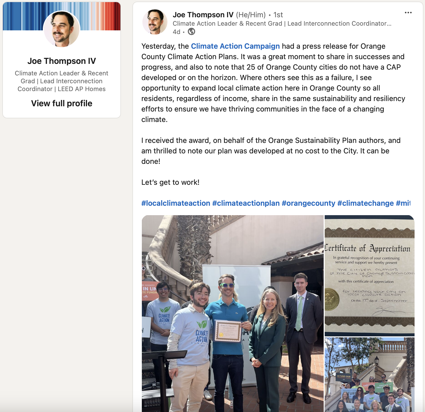 Last week, our Local Climate Action Program (LCAP) graduate Joe Thompson accepted an award on behalf of the Orange Sustainability Plan. Joe has taken a remarkable step that we hope for and dream of: applying the skills he learned in the LCAP and in his Energy & Sustainability Policy degree to his civic and professional life. He did this by collaborating with a professor and class at Chapman University and by serving on the City’s Sustainability Committee. Basically, he created an LCAP in California.