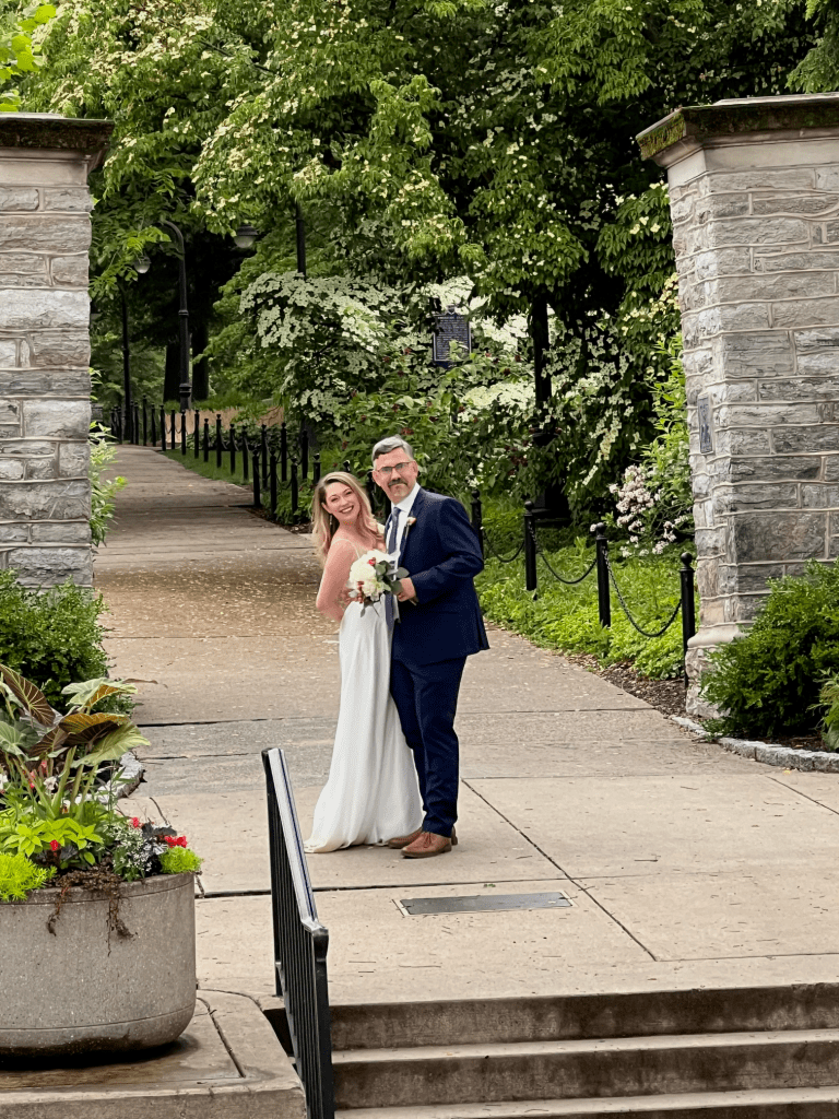 I am in central Pennsylvania right now where I live with my family. Outside, it is wet because it has rained for the last 10 hours. The temperature is 9° C (47° F). Soon, I will go to work. I accept today. I accept that it is warmer on this December day than it was 40 years ago when I was in third grade. I accept this change because it is simply what it is. I accept that there were wildfires that unleashed the worst air quality in the world on central Pennsylvania in June 2023, altering the color of the sky on my wedding day. The rain had cleared the smoke just an hour before Hilary walked across the bridge in Spring Creek Park and then across a muddy patch that stained her dress (picture from that evening to the right, where you can see the stain). The stain is still on that dress. I accept that this year there were wildfires in the northeast, including Pennsylvania. But today, I am in my home office on a cool but still unseasonably warm day, using electric heat from a fossil-heavy grid but my electricity contract is for 100% renewable.